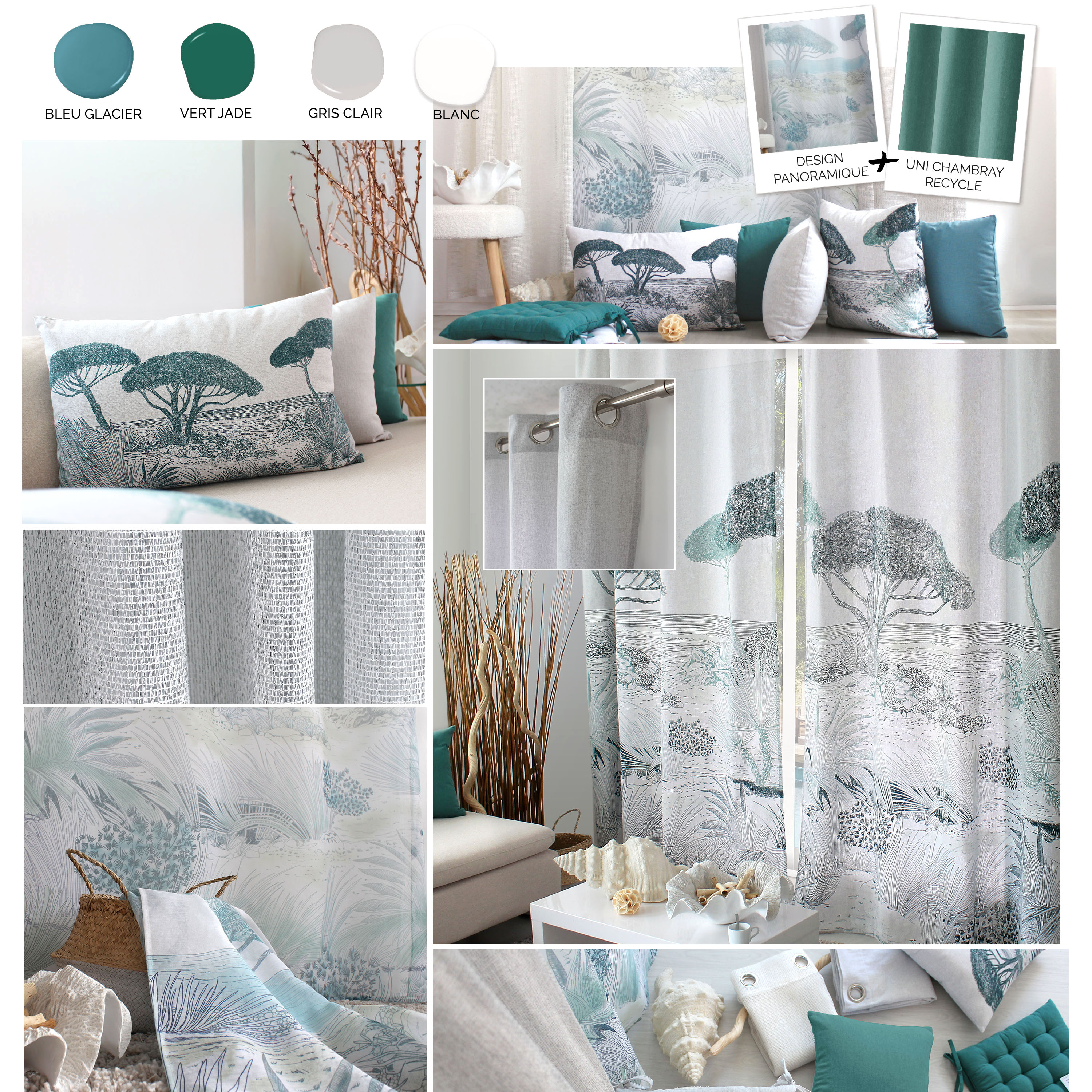 Ce qui nous inspire : le bord de mer qui s’invite dans nos intérieurs avec des designs XXL panoramiques et la pinède avec sa palette de couleurs vert jade et bleu glacier.